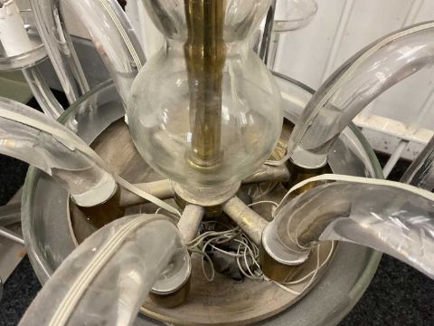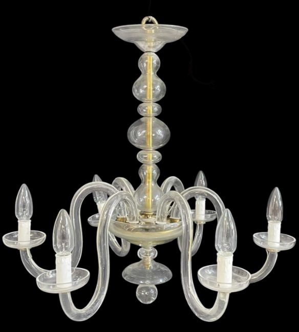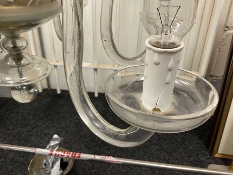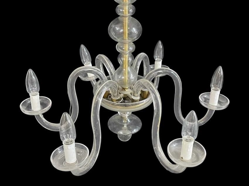 EARLY 20TH C. 6-LIGHT CLEAR GLASS CHANDELIER, multiple section baluster centre column, shallow bowl, scrolled arms, pendant ball, approx. 80cms (w), 80cms (drop)Provenance: private collection Vale of GlamorganComments: converted with cables running over the chandelier arms, appears to be complete and in good order, plastic candle sleeves brittle and/or damaged, some sockets slightly loose, untested, inspection advised