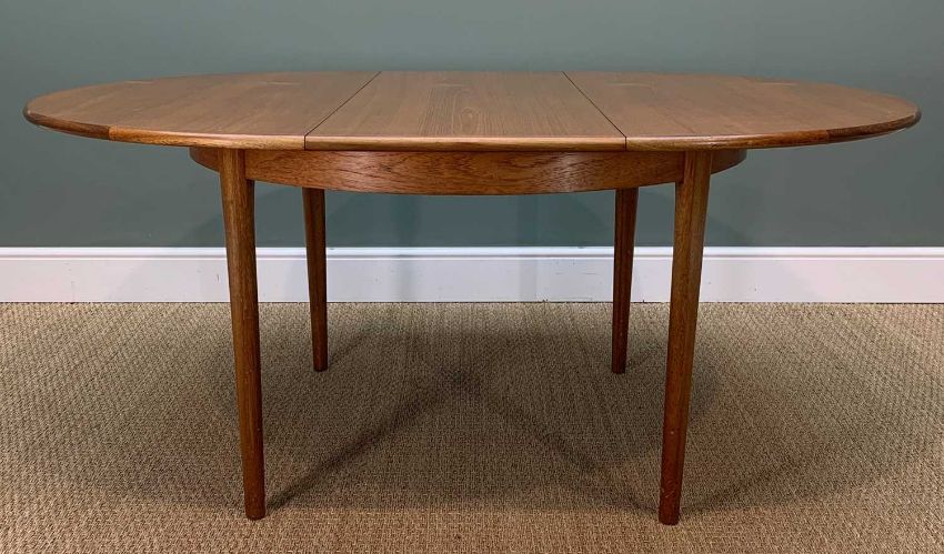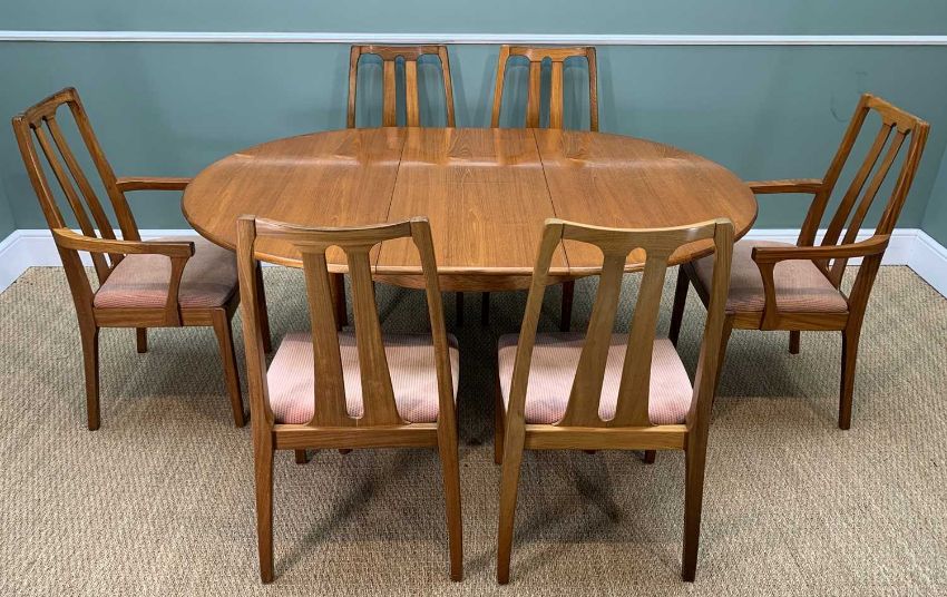 MID-CENTURY NATHAN TEAK EXTENDING DINING TABLE AND CHAIRS, 74 (h) x 122 (w) (+46cms butterfly extension) x 120cms (d), four dining chairs, two carvers (7)Provenance: consigned via West WalesComments: minor signs of use, no apparent damage or losses, inspection advised