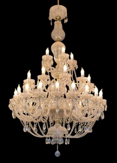 FINE BOHEMIAN / CZECH 32-LIGHT MOULDED & CUT GLASS CHANDELIER, 20th C., branches arranged in three tiers, with crystal swags, frosted baluster column, drop approx. 5-6 feetProvenance: private collectionNotes: not displayed in saleroom, boxed for delivery, not checked for completeness, available to view in the saleroom, inspection advised therefore.