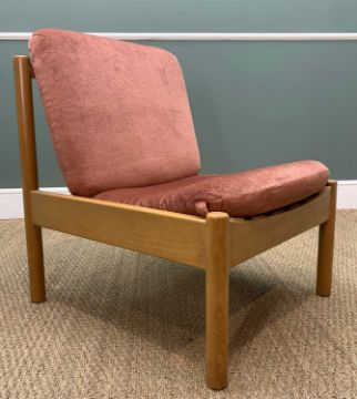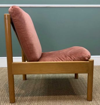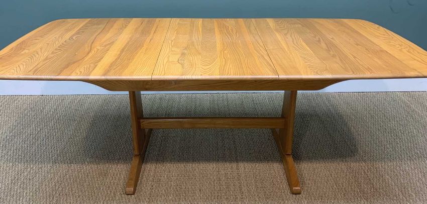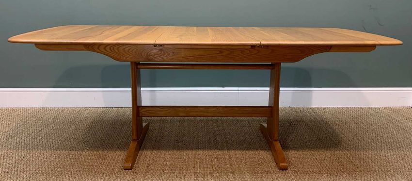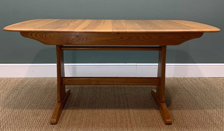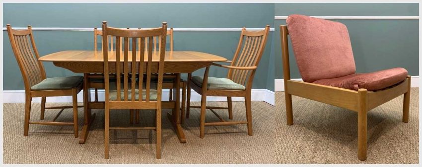 LATE 90'S ERCOL DINING SUITE, comprising Windsor Medium extending dining table 1157, 73 (h) x 151 (w) (210 with butterfly extension) x 92cms (d), four Penn Classic dining chairs, one Penn Classic armchair, together with one earlier (blue label) Modular 747 Lounge Chair (7)Provenance: private collection NewportComments: table in very good condition, natural finish, no significant scratches/damage/stains, one Penn Classic chair has one missing seat slat and one loose seat slat, Penn Classic armchair arm loose and requires glueing, 747 chair webbing brittle and sagging, inspection advised