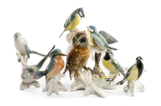 SELECTION OF KARL ENS PORCELAIN BIRDS including, Great Tit, Tawny Owl, Pair of Long Tailed Tits, Kingfisher, Jay & Pair of Blue Tits, together with Goebel CV88 Firecrest (7)Provenance: private collection CardiffComments: all appear to in good, undamaged condition however inspection advised