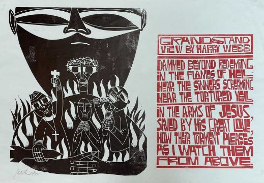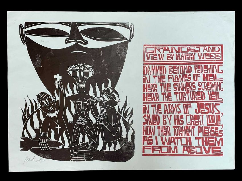 ‡ PAUL PETER PIECH (American, lived / worked Wales 1920-1996) two-colour woodcut print - quote from British activist Harry Webb, 'Grandstand View', signed and dated 1990, 45 x 64cmsProvenance: private collection NetherlandsComments: unframed