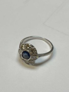 WHITE METAL SAPPHIRE & DIAMOND CLUSTER RING, central sapphire within border of eight round cut diamonds (0.8cts overall approx.), ring size M 1/2, 2.1gmsProvenance: private collection Conwy County BoroughComments: wear overall commensurate with age, inclusions overall, viewing recommended