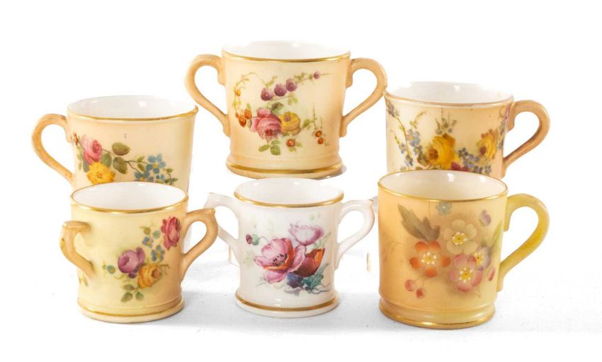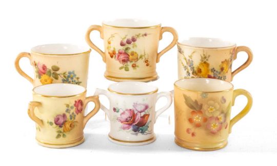 ASSORTED ROYAL WORCESTER CHINA MINIATURES, including flower painted blush ivory tygs, tankards & loving cup, jar and cover, and a Grainger's Worcester tankard similar (6)Provenance: private collection CardiffComments: good overall.