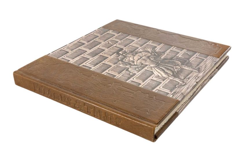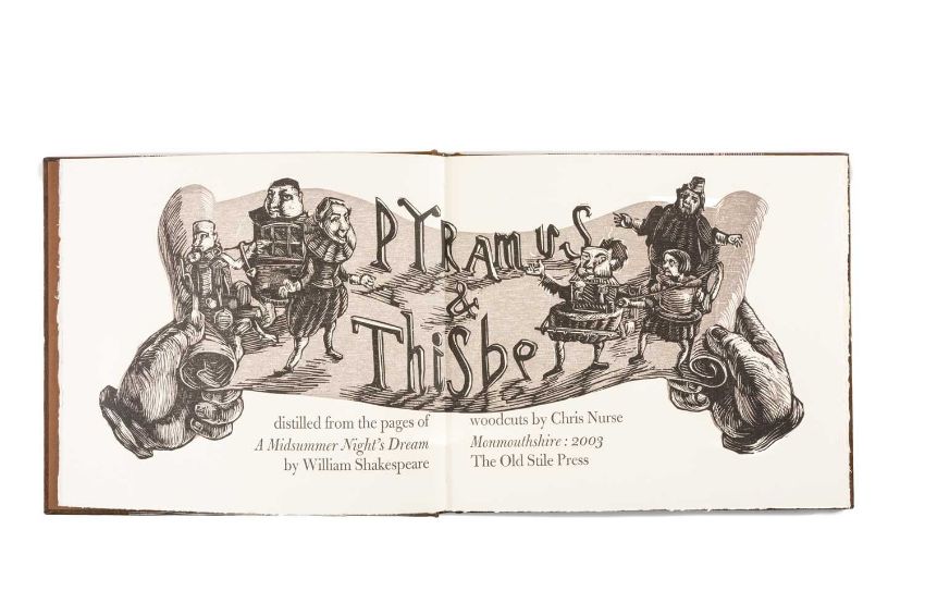 SHAKESPEARE (WILLIAM) Pyramus & Thisbe, images by Chris Nurse, published by THE OLD STILE PRESS, 2003, limited edition 30/160, signed by the artist, all the images, single and two-colour are woodcuts by Chris Nurse and were printed from the wood, the book is half-bound in brown leather with heavy boards covered with printed papers with designs by the artist, further designs, together with titling, are blind-blocked on the leather.Auctioneer's Note: The Old Stile Press in Monmouthshire was started by Frances and Nicolas McDowall in 1979. Well known internationally for the quality of their books. Books are designed and printed by Nicholas McDowall, working collaboratively with the artists. All the printing is letterpress and leaf printing, and using wood blocks, wood engravings and lino blocks. The Old Stile Press is a well-known private press and publishing house that specializes in creating limited-edition, finely crafted books. Founded by British printer and publisher Nicolas McDowall in the early 1980s, the Old Stile Press is highly regarded.Provenance: private collection Vale of GlamorganComments: a fine example