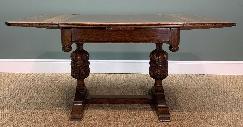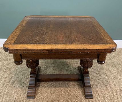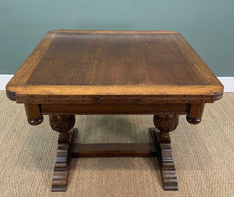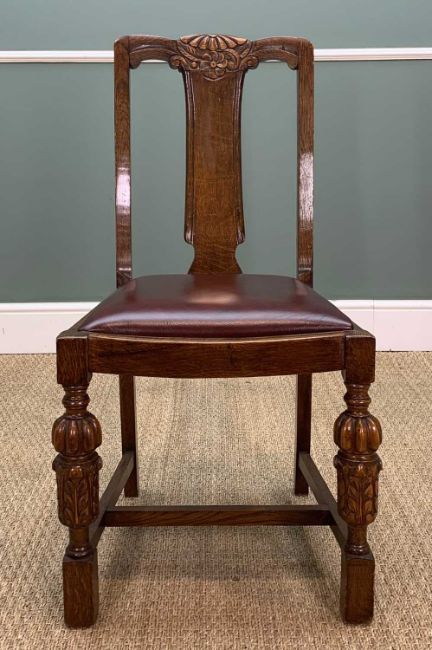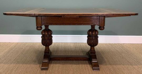 EARLY 20TH C. ELIZABETHAN STYLE CARVED OAK DINING SUITE, comprising bow front sideboard, 132 (h) x 136 (w) x 53cms (d), extending table, 75 (h) x 92cms (sq.) (152cms extended) plus four upholstered dining chairs (6)Provenance: consigned via West WalesComments: good condition, no apparent damage or significant wear