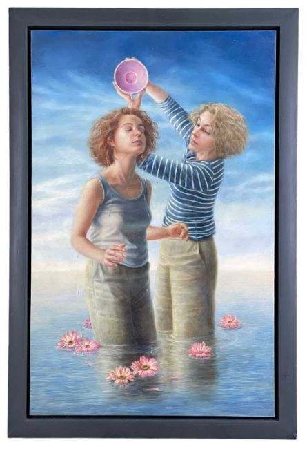 ‡ SALLY MOORE (Welsh b.1962) oil on panel - entitled verso, 'Baptism', signed and dated verso 2002, 69 x 43cmsProvenance: private collection BridgendComments: framed, ready to hang