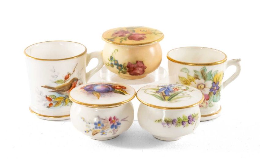 ASSORTED ROYAL WORCESTER CHINA MINIATURES, including flower painted tankard & loving cup, robin painted tankard, 2 jars and covers (5)Provenance: private collection CardiffComments: good overall.