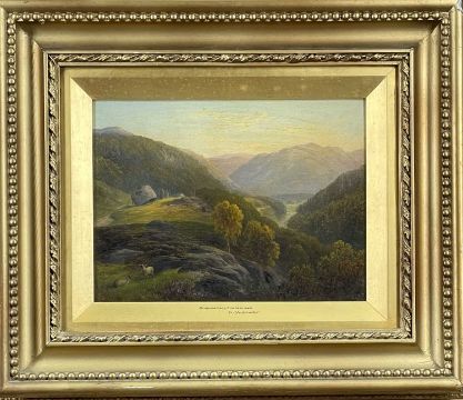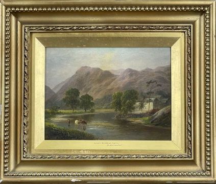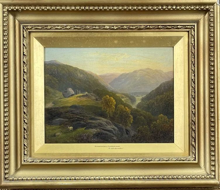 GEORGE ALEXANDER (1832-1913) pair oil on canvas - 'Borrowdale, Cumberland' of sheep grazing in landscape and the Bowder Stone, monogrammed and dated 1905, and 'The Grange Near Derwent Water, Keswick' depicting cattle wateringProvenance: private collection West WalesComments: both framed and glazed, minor losses to frame