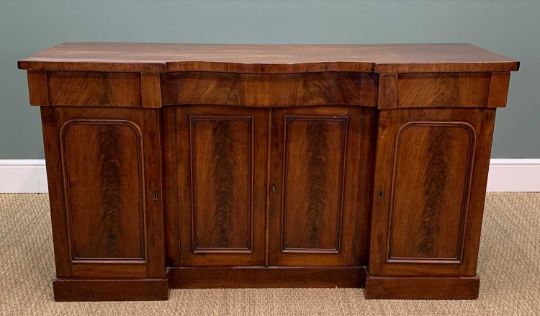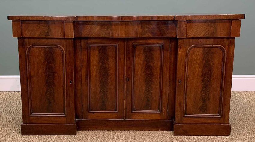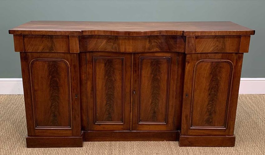 VICTORIAN MAHOGANY SIDE CABINET, inverted breakfront form, fitted frieze drawers and panelled cupboards, plinth, 84 (h) x 151 (w) x 49cms (d)Provenance: private collection Vale of GlamorganComments: top slightly faded in part, light scratches, inspection advised