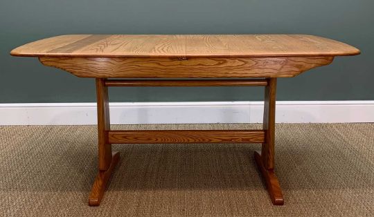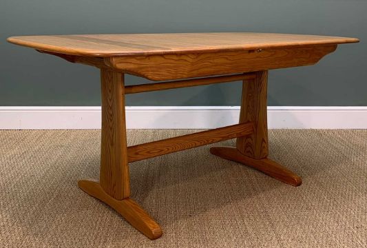 LATE 90'S ERCOL DINING SUITE comprising, Windsor medium extending dining table model 1157, 73 (h) x 151 (2009 extended) (w) x 92cms (d), four Windsor dining chairs model 877 with seat cushion, 889cms (h), 'light finish', gold tree button badge (5)Provenance: private collection CardiffComments: no significant condition issues, very minor and barely noticeable light scratches to table top, butterfly extensions slightly lighter