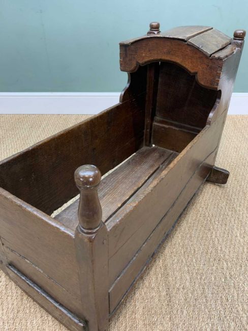 ANTIQUE PANELLED OAK CRIB, with hood, turned finials on bowed rockers, 68 (h) x 92 (w) x 54cms (d)Provenance: deceased estate CardiffComments: base boards warped, two panels with large splits, old repairs and damage to panels, colour good