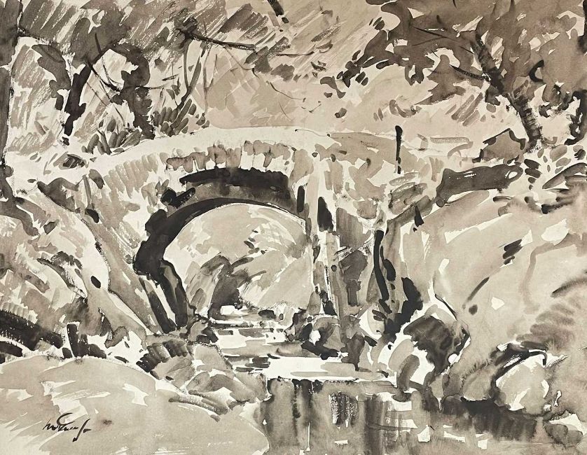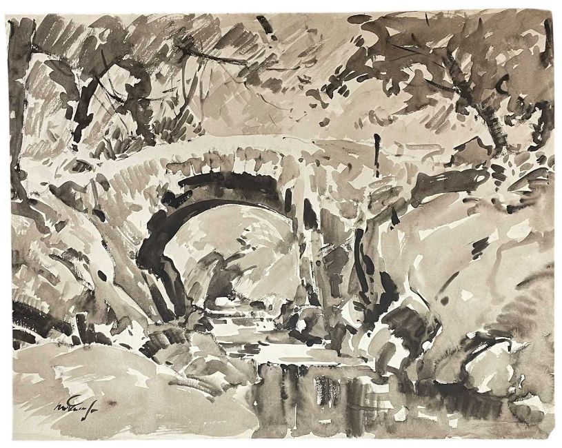 ‡ WILL EVANS (Welsh 1887-1957) ink wash - stone bridge over a river, signed, 38 x 49cmsProvenance: private collection DerbyshireComments: pinholes in the corners, unframed