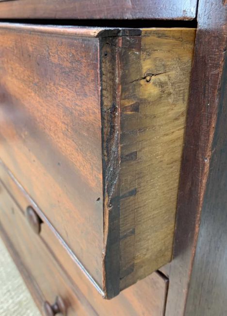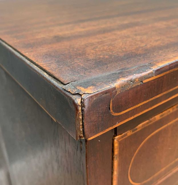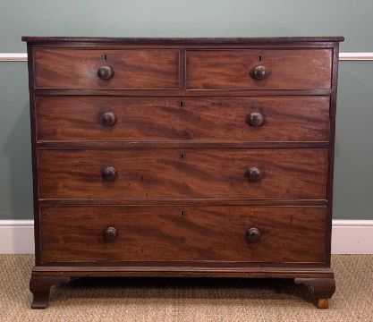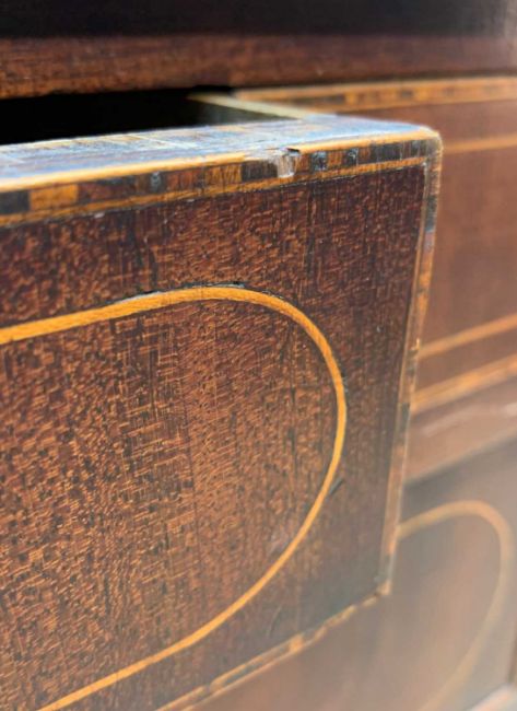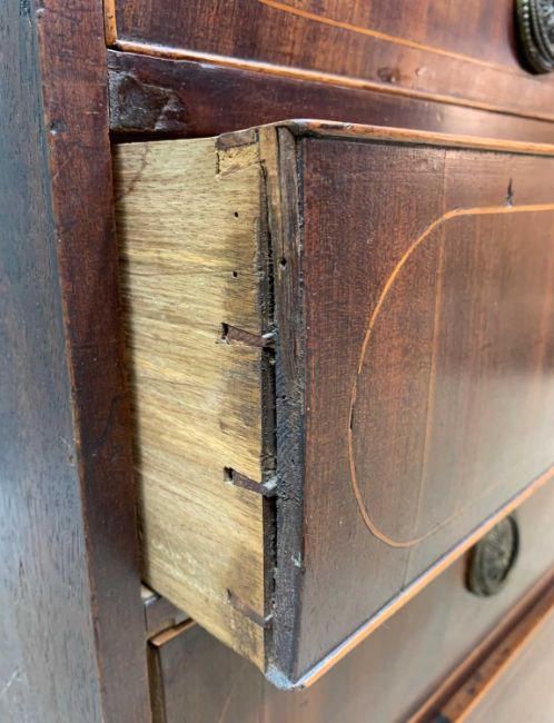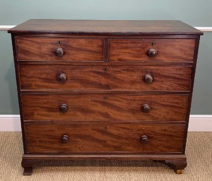 TWO ANTIQUE MAHOGANY CHESTS, one with two narrow concealed frieze drawers flanking dummy panel, boxwood stringing, later applied circular metal pulls, 94 (h) x 111 (w) x 51cms (d), other with boxwood strung top, turned handles, oak liners, 106 (h) x 117 (w) x 53cms (d)Provenance: consigned via West WalesComments: smaller chest with water stains, warped drawer fronts, damaged cockbeading, veneer losses and splits, reduced feet, other with stained top, splits, veneer losses, moulding losses, inspection advised