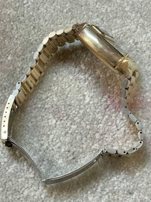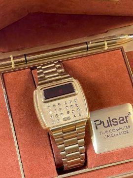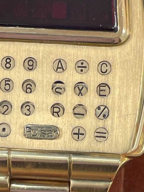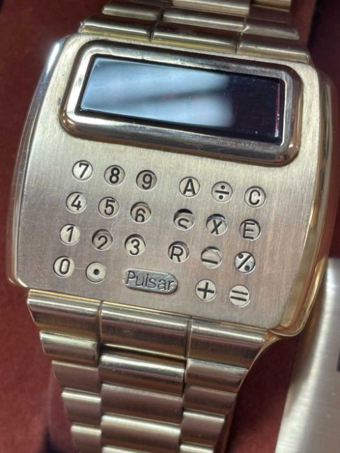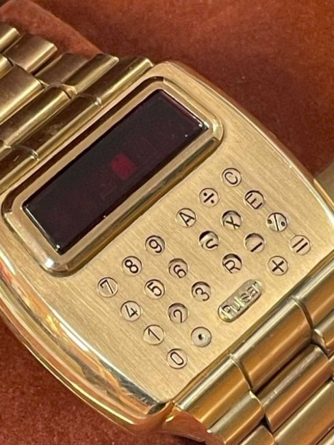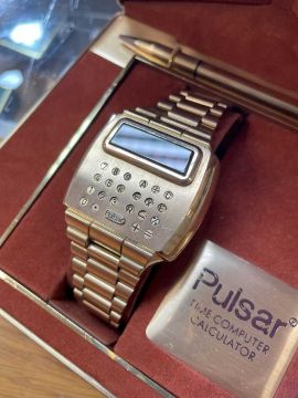 PULSAR GOLD PLATED 'TIME COMPUTER CALCULATOR' BRACELET WATCH SET, c. 1970s, ref. 3822-2, presumed 901 quartz movement, LED window above keypad, on President-style bracelet with deployant clasp, signed case and clasp, with Garland double-propelling ballpoint, original leaflet and box, outer card box with paper label with matching ser. no., 41mm.Provenance: private collection Swansea Comments: lightly rubbed case, bracelet and box. cardboard box split edge Condition Report:buttons look 'pushed in'