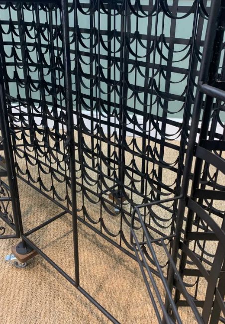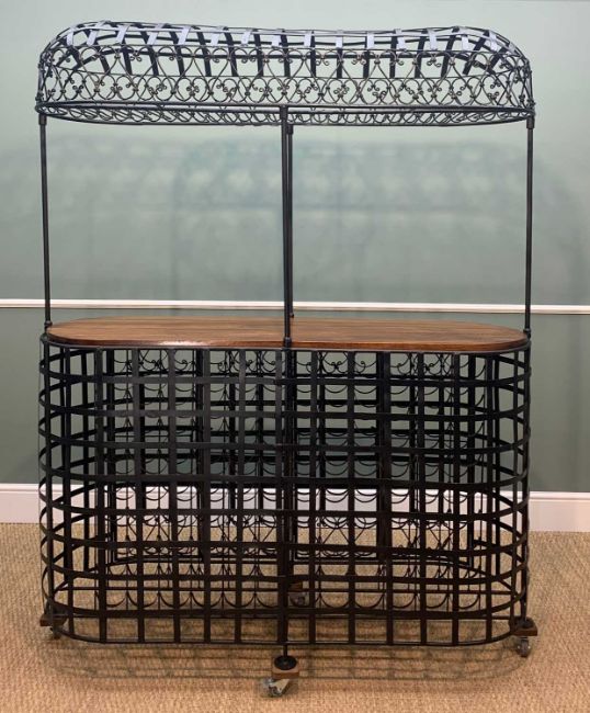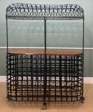 BESPOKE 'EVENTS' PORTABLE WINE BAR, metal framework, internal racking to hold 108 bottles, upper hood with racking to hang wine glasses, oak counter, raised on four castors (lockable), 195 (h) x 153 (w) x 50cms (d)Provenance: private collection PowysComments: good condition, hood and supports removeable for transportation, castors later applied (removeable), inspection applied