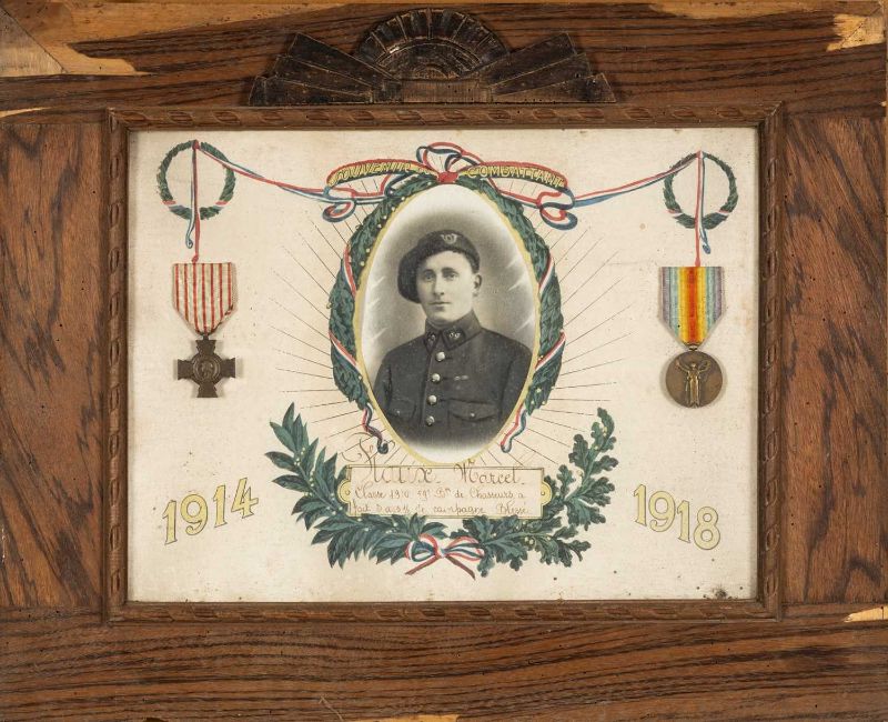 FRAMED FRENCH MILITARY MEDALS & MEMORIAL PHOTOGRAPH comprising Croix du Combattant and Victory medal, framed and glazedProvenance: private collection from a home in BrittanyComments: wear and tear commensurate with age, losses to frame, stains, viewing recommended