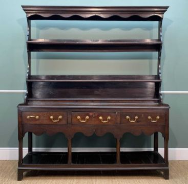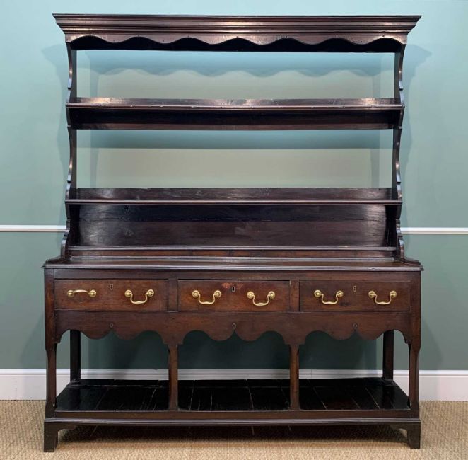 ANTIQUE SOUTH WELSH OAK POTBOARD DRESSER, open rack, frieze drawers, shaped apron, 206 (h) x 176 (w) x 45cms (d)Provenance: private collection SwanseaComments: open rack possibly associated, loose mouldings/rack foot, inspection advised