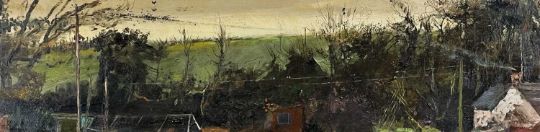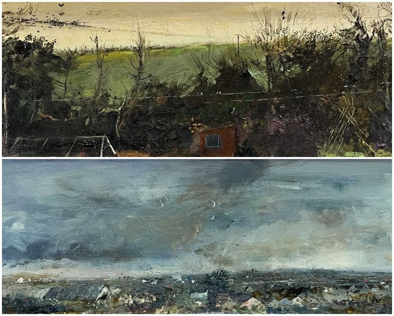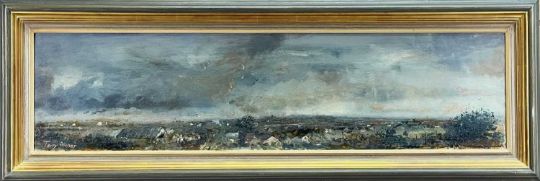 TERRY PILCHER (b. 1926) two oils on board - Starlings, signed, 20 x 75.5cms; Storm Clouds, signed, 23 x 91.5cms, both titled verso on 1993 Royal Academy labels (2)Provenance: private collection PowysComments: framed, surface dirt, would benefit from light clean.