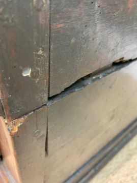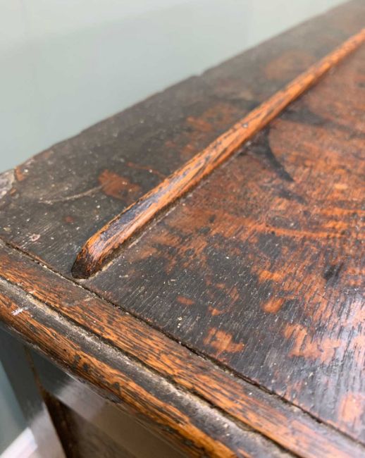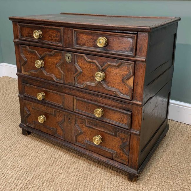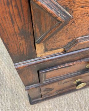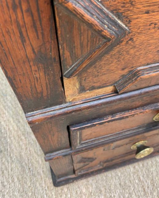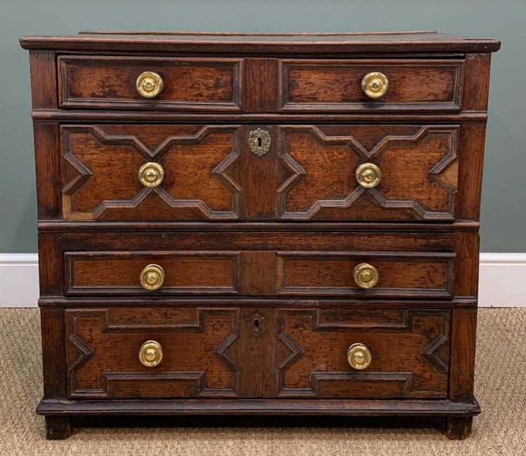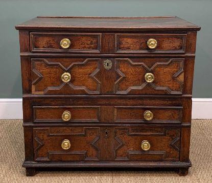 CHARLES II STYLE OAK GEOMETRIC FRONTED CHEST, hung drawers, two-part construction, 85 (h) x 95 (w) x 56cms (d)Provenance: private collection SwanseaComments: moulding loss to drawers, splits, general staining, old worm, inspection advised
