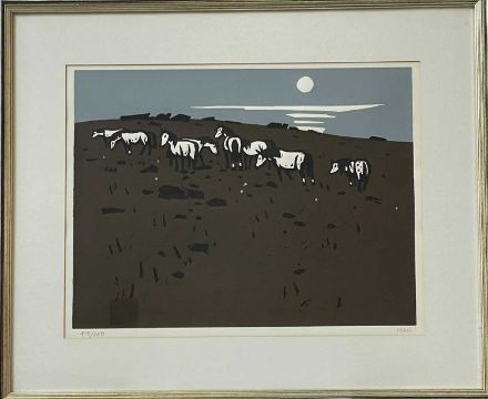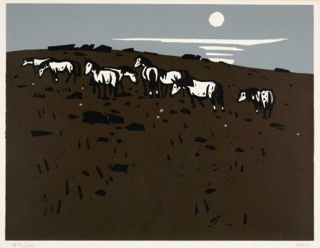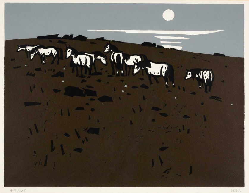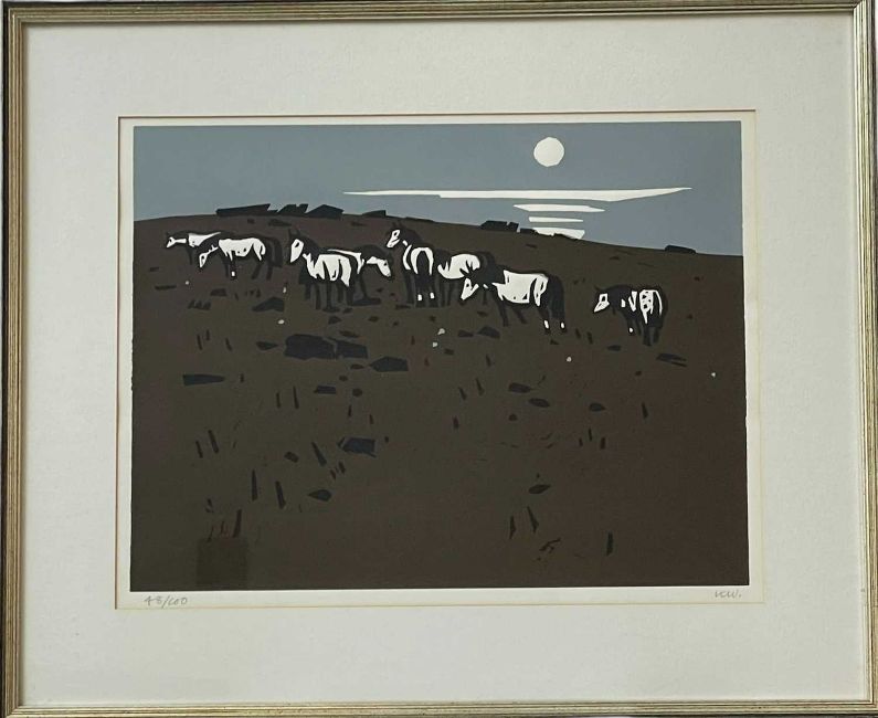 ‡SIR KYFFIN WILLIAMS RA (1918-2006) limited edition (48/100) linocut - a group of ponies on a hillside, signed with initials, 35 x 46cmsProvenance: private collection GloucestershireComments: framed, glazed