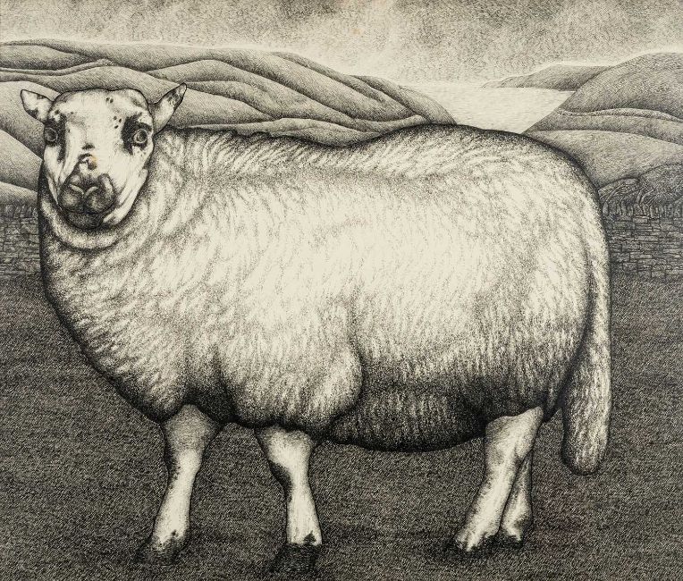 ‡ SEREN BELL (b.1950) large pen and ink - study of a standing Welsh Mountain Sheep, entitled 'Tinsy' with the Dyfi landscape beyond, 75 x 89cmsAuctioneer's Note: according to the vendor, 'Tinsy was a Welsh mountain lamb, the pet of May at Cymerau Hall, Glandyfi in the late 1980’s. She was a pampered pet, often seen in the kitchen at the Hall. May would frequently be seen walking down the lane with Tinsy on a collar and lead then catching the local bus to Machynlleth…. no one batted an eye lid, not even the bus driver'! Seren Bell lived in Aberystwyth at that time and was commissioned by May’s father to do the painting of Tinsy in her field overlooking the Dyfi Estuary.Provenance: private collection CeredigionComments: framed, sl. browning to Tinsy's nose, ready to hang