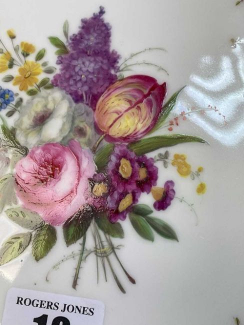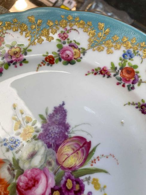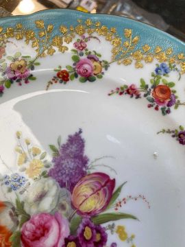 NANTGARW CABINET PLATE circa 1818-20, London-decorated probably in the Sims workshop with central flower spray including variegated tulip, further flowers in coloured enamels and tooled gilt at the turquoise border, gilt shaped rim, impressed 'NANT-GARW CW' mark, 23.8cmsProvenance: private collection London