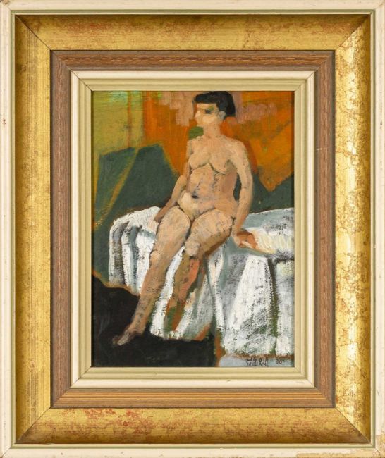 ‡CLAUDIA WILLIAMS (1933-2024) oil on board - female nude seated on bed, signed and dated '80, 22.5 x 16.5cmsProvenance: private collection Isle of SkyeComments: framed