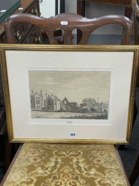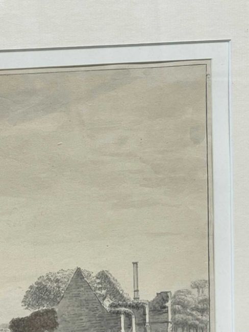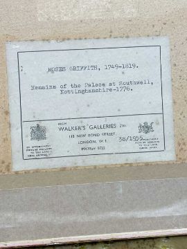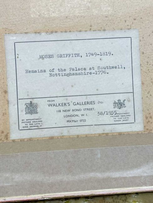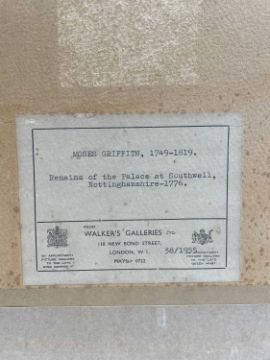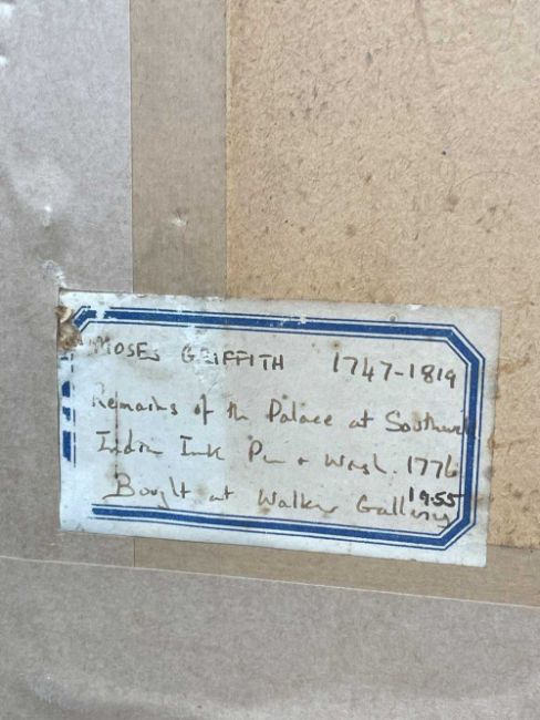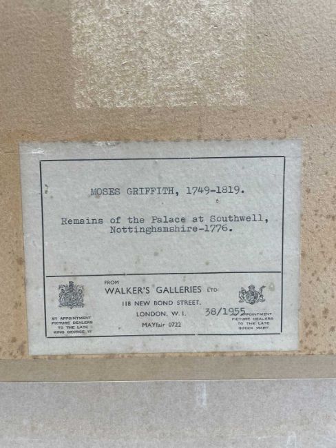 ‡MOSES GRIFFITH (1747-1819) Indian ink, pen and wash - entitled verso 'Remains of the Palace at Southwell', signed 'Moses Griffith delin', 20.5 x 30.5cmsNote: fine and typical example of a topographical drawing by Moses Griffith, likely to have been ordered by the artist's patron and employer, the antiquarian Thomas Pennant, in the course of their travels together. Southwell Minster was founded in the Saxon period and was rebuilt by the Normans as an independent church in the Diocese of York. The Palace was built to house the Archbishop of York when he was resident and was extant at the time of the Domesday Book. However, both the Minster and the Palace were severely damaged during the Civil Wars and while the former was later rebuilt, the Palace remained the romantic ruin shown here. Since Moses Griffith recorded the scene, probably in the late 1770's, the ruins have been further reduced by the use of the stone in local buildings. The verso side of the painting contains sketches of architectural details.Provenance: Thomas Pennant (1726-1798), by descent to his grand-daughter who married the Earl of Denbigh. By descent to Viscount Fielding. His sale, Newnham Paddox, Warwickshire 1938. Bought by the Walker Galleries, 118 New Bond St, London. Sold at their Moses Griffith exhibition of 1955 (their label verso)Comments: framed and glazed, ready to hangCondition Report:foxing in the sky area