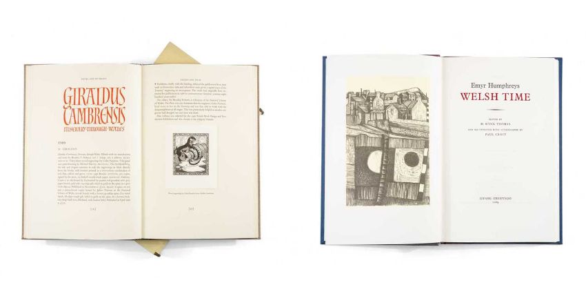 GWASG GREGYNOG: ‘Welsh Time’ representative passages of Emyr Humphreys’ work, published as a tribute on his ninetieth birthday, selected and edited by M. Wynn Thomas, illustrated by Paul Croft, 2009 quarter cloth, limited edition (38/175), together with a descriptive catalogue of printing at Gregynog 1970 - 1990’, compiled by David Esslemont and Glyn Tegai Hughes, 1990, limited edition (771/855), one of 100 copies bound in quarter leather, with slipcaseProvenance: private collection GwyneddComments: immaculate edition from an immaculate collection, unused and still in retail wrapping