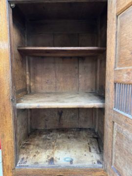 RARE WELSH BREAD & CHEESE CUPBOARD circa 1790-1800, of very narrow proportions, probably Caernarfonshire of good consistent colour, 66cms (w) at cornice, 188cms (h)Auctioneer's Note: especially rare item of Welsh furniture, a single narrow food cupboard recorded in 'Welsh Furniture' by Richard Bebb, that example of a plainer form without the ventProvenance: private collection ConwyComments: good overall condition, later applied roller-ball door latches, old worm (internal), inspection advised