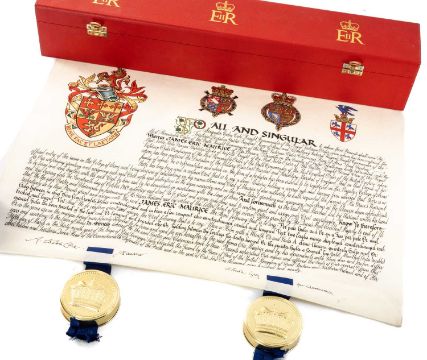 GRANT OF ARMS LETTERS PATENT to James Eric Maurice of Llanarth, Dyfed, dated 17th October 1989Provenance: private collection Ceredigion