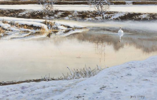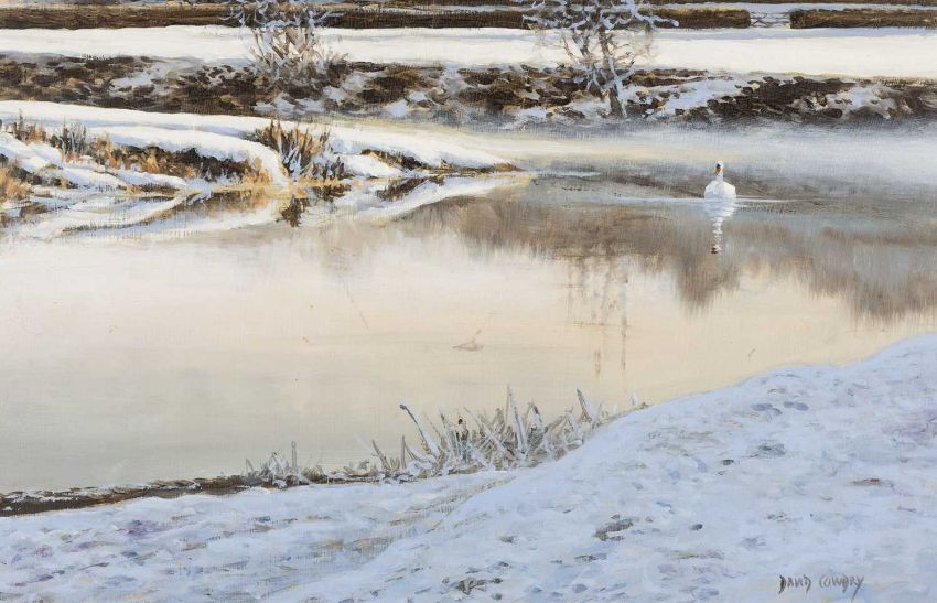 ‡DAVID COWDRY oil on board - winter landscape with swan, signed, 19 x 29cmsProvenance: private collection BridgendComments: framed