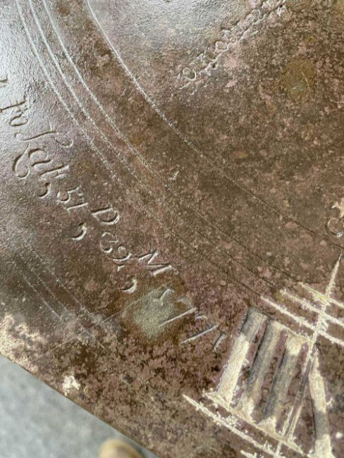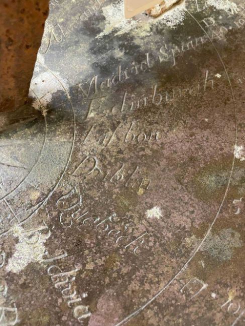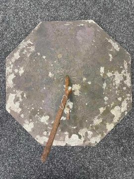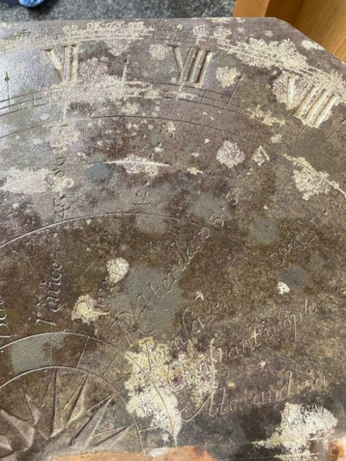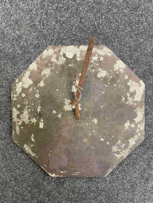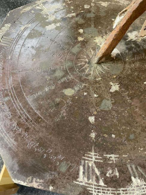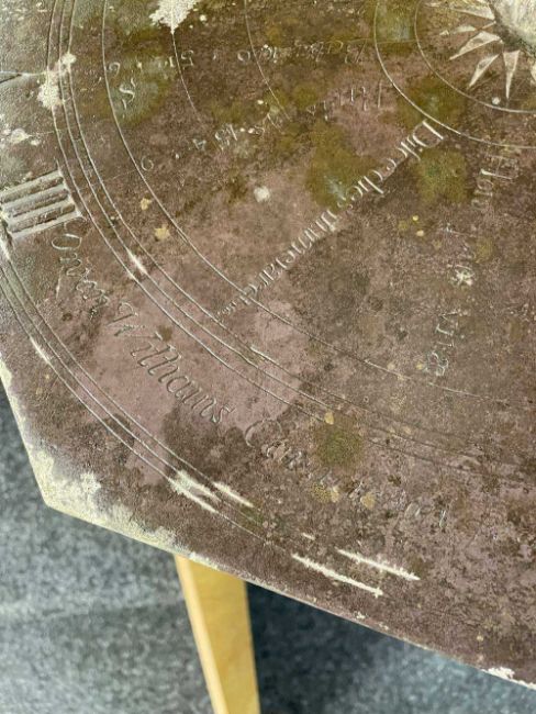 RARE 18TH CENTURY WELSH SLATE SUNDIAL BY OWEN WILLIAMS OF CARNARVON of octagonal form, inscribed with maker and dated 1771, engraved Roman numerals, compass with ancient locations around e.g. Rome, Venice, Bethlehem, Jerusalem, Paris, together with Latin mottos e.g. Hora pars vitae etc., part of iron gnomon remaining, 50cms (diam.)Provenance: private collection Ynys Môn (Anglesey)