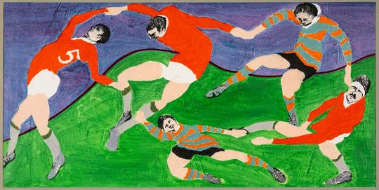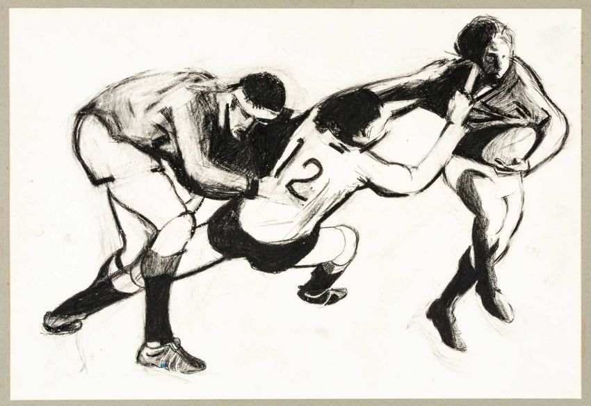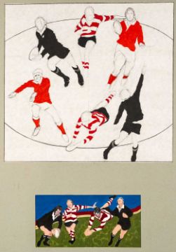 ‡TERRY JONES (1938-1992) mixed media on paper - set of four unframed paintings depicting scenes from the game of rugby, various sizes the largest being 47 x 62cmsProvenance: private collection TorfaenComments: all four mounted but unframed