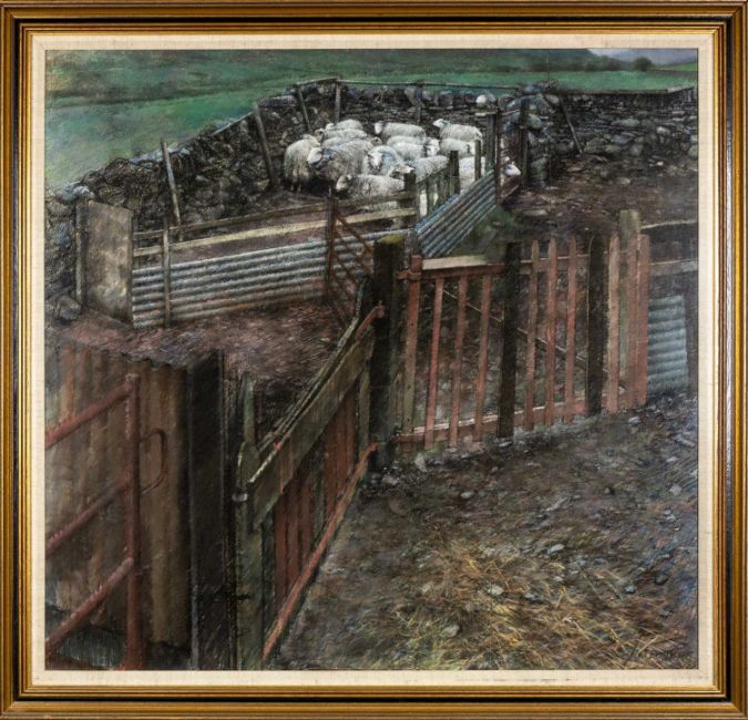 ‡KEITH BOWEN (b. 1950) pastel - sheep pen, signed and dated 1985, 88 x 93cmsProvenance: private collection ConwyComments: framed and glazed