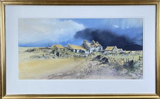 ‡MALCOLM EDWARDS (b. 1934) watercolour - farmstead with dark skies looming, signed, 36 x 74cmsProvenance: private collection BuckinghamshireComments: framed, glazed