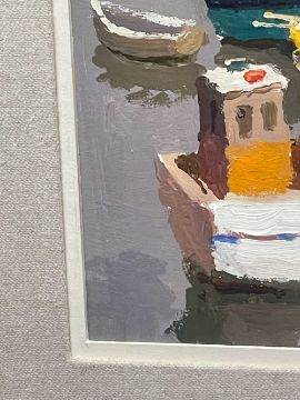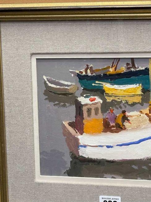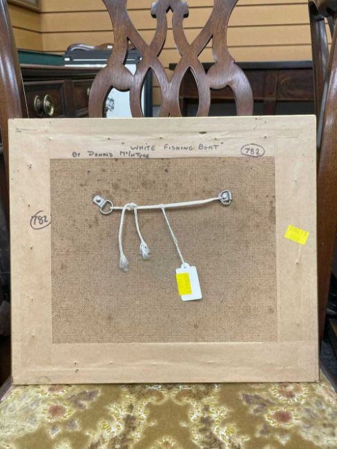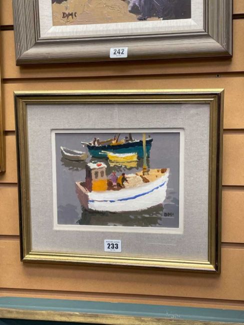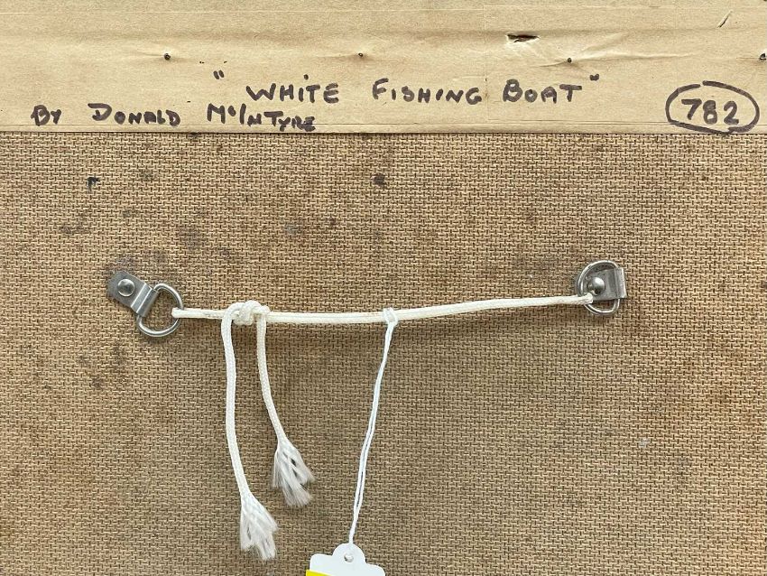 ‡DONALD McINTYRE (1923-2009) acrylic - entitled verso, 'White Fishing Boat', signed with initials, 17 x 22cmsProvenance: private collection DevonComments: framed, glazed