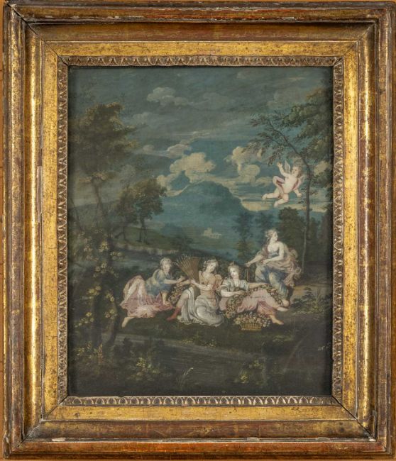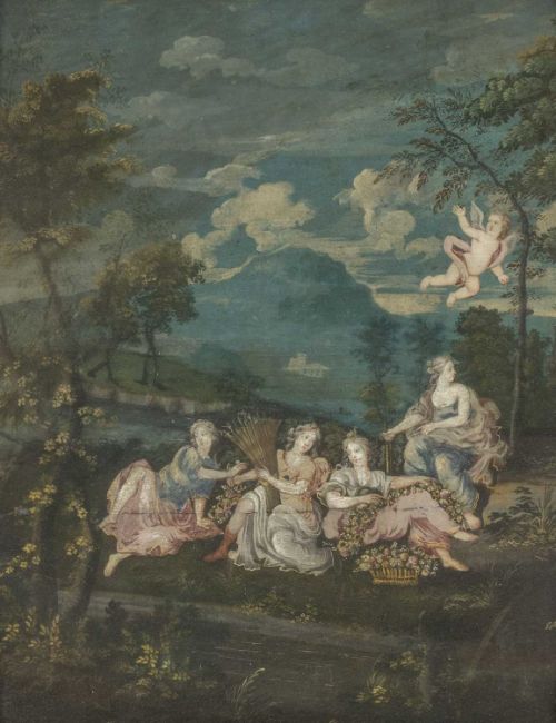 FOLLOWER OF FRANCESCO ALBANI 18th Century oil on panel - classical maidens and cupid in an Italianate landscape, 33 x 27cmsProvenance: private collection CardiffComments: cleaned, loose in frame, advise reframing.