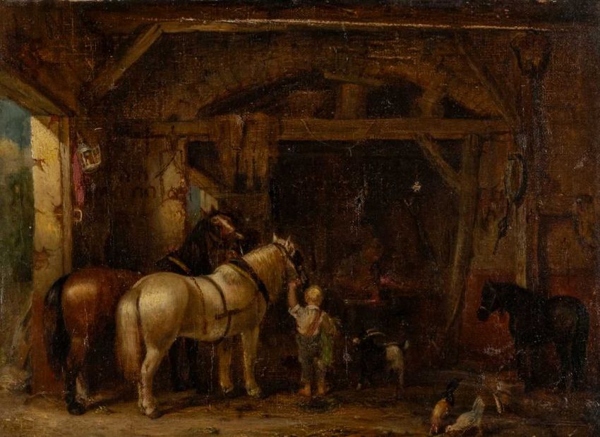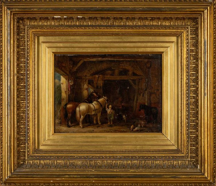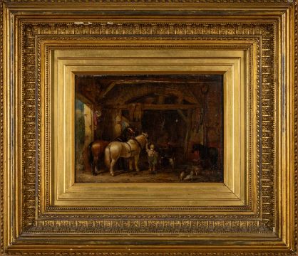 MANNER OF JOHN FREDERICK HERRING JNR. (1815-1907) oil on canvas - stable interior with ponies, child, farrier, goat, and hens, 21.5 x 30cmsProvenance: deceased estate SomersetComment: period gilt gesso frame with small losses, canvas cleaned with some retouching.