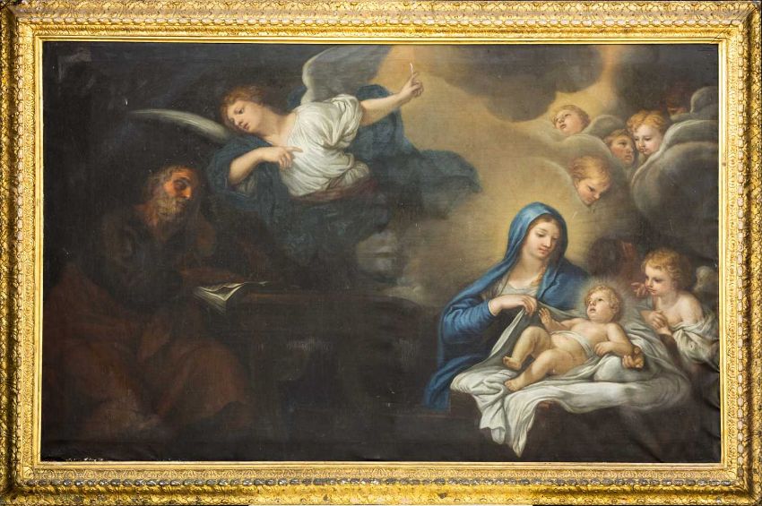 18TH CENTURY ROMAN SCHOOL exceptionally large oil on canvas - St Joseph's Dream, 148 x 238cmsProvenance: from an historic north Wales church where it was believed hung for over 100 yearsComments: in super period gilt gesso frame, unsigned, antique condition. NB. collection advisory: dimensions including frame are substantial. Condition Report:with frame 180 x 270cms
