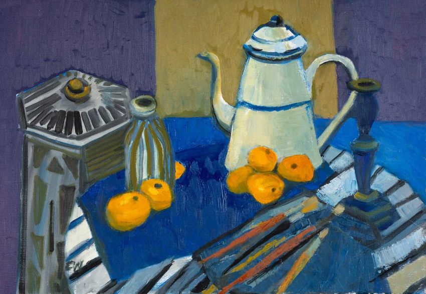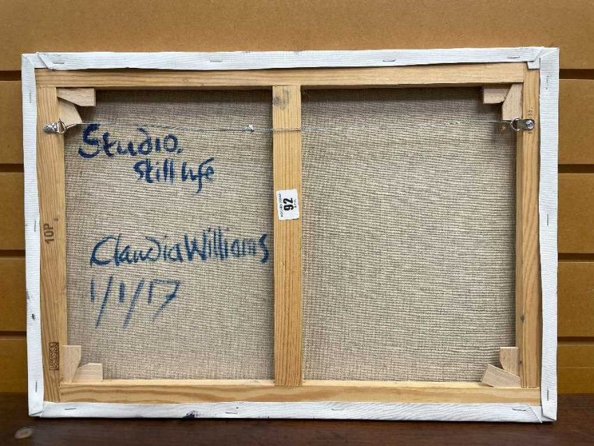CLAUDIA WILLIAMS oil on canvas - entitled verso 'Studio, Still Life', signed with initials, signed and dated 2017 verso, 38 x 55cmsComments: unframed canvas