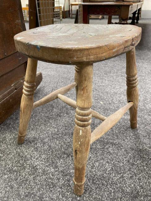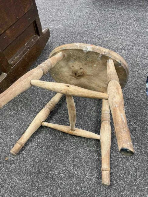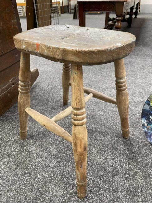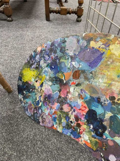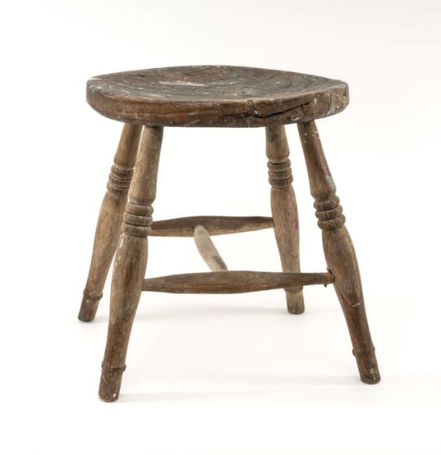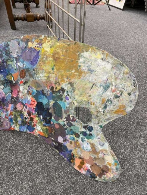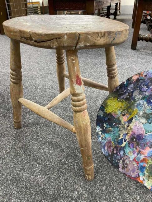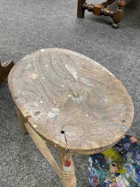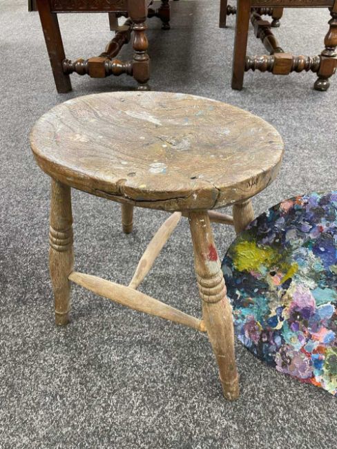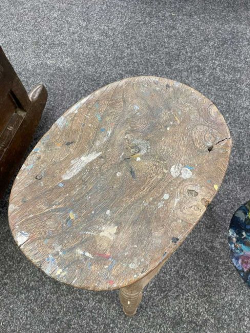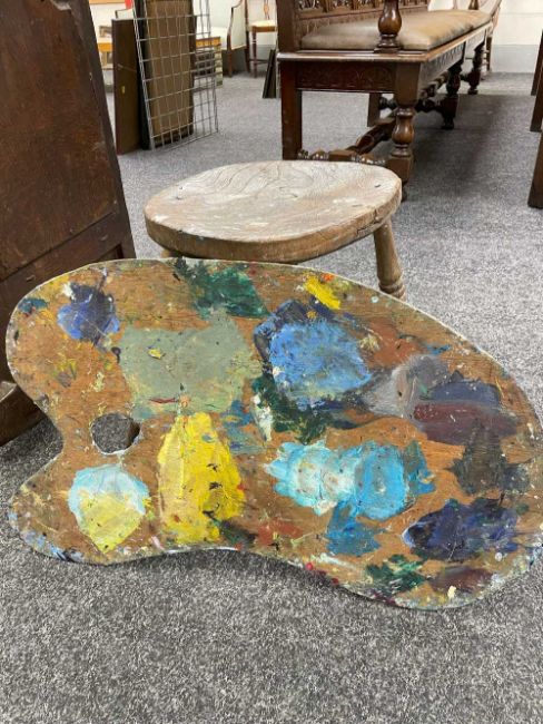 GWILYM PRICHARD PAINTER'S STOOL AND PALETTE - studio used, large painter's palette 65cms (w), small oak painter's stool 40cms (h)
