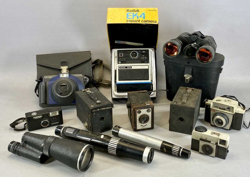 VINTAGE CAMERAS & ASSOCIATED ITEMS, including box Brownies, Russian monocular, 10x50 binoculars, etc.Provenance: deceased estate Denbighshire