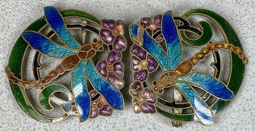 FOUR VINTAGE BELT BUCKLES, comprising Art Nouveau enamelled dragonfly buckle, blue enamelled polka-dot buckle, Art Deco celluloid and embossed white metal buckle, and pierced EPNS buckle and part beltProvenance: deceased estate Denbighshire
