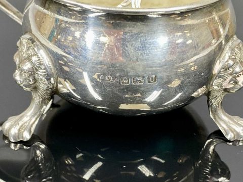 GEORGE IV SILVER THREE-PIECE CONDIMENT SET, of plain circular form, with lion mask capped claw feet, Joseph Gloster, Birmingham 1944, 7oztProvenance: private collection Conwy