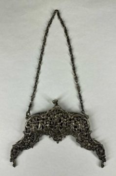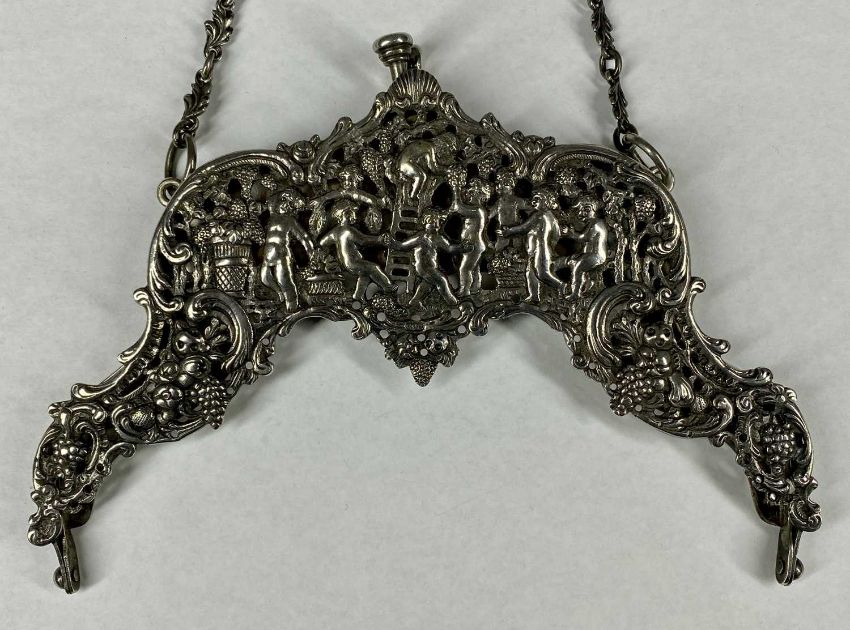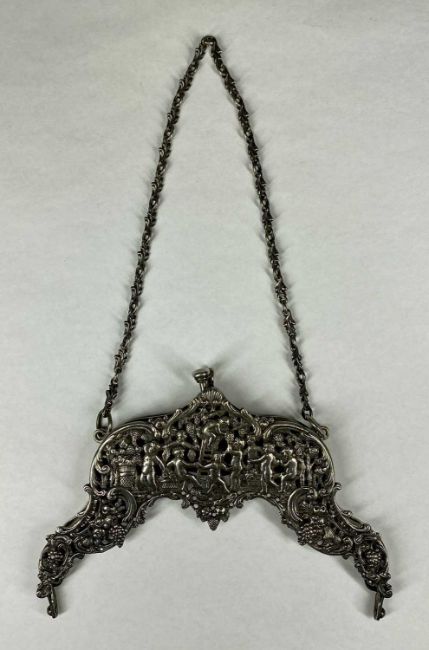 CONTINENTAL WHITE METAL HINGED PURSE MOUNT, one side ornately pierced and chased with cherubs grape picking, fancy link chain, stamped 800, 17.5cms (w), 5oztProvenance: private collection Conwy