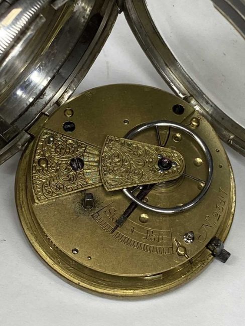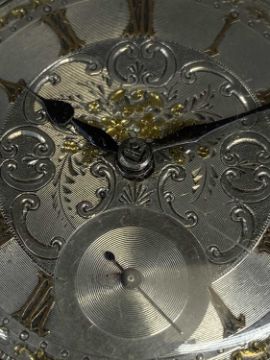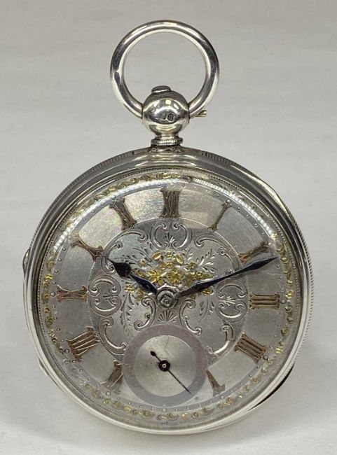 GEORGE V SILVER-CASED POCKET WATCH, keyless, ornate dial with raised gold Roman numerals and floral engraving to centre, subsidiary seconds dial, fusee movement, London 1927, 55mms (diam.)Provenance: private collection Conwy