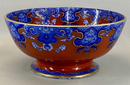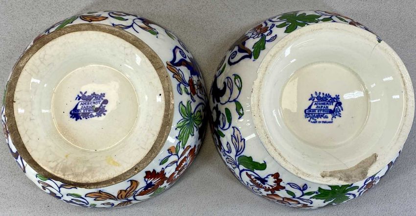 GROUP OF 19TH CENTURY BOWLS, pair of Amherst ironstone Japan pattern fruit bowls, 19.5cms (diam.), Bretby style green glazed bowl on claw feet, 25cms (diam.), large Kaolin Ware Chinese pattern punch bowl, 35cms (diam.)Provenance: The Cornelia Bayley Collection from the historic Welsh Jacobean house, Plas Teg, Flintshire. Further auctions to follow including Plas Teg Principal Interiors, further details on this important Jacobean house and its clearance Welsh House Clearance of a Generation — Rogers Jones Co