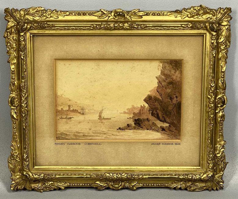 JAMES BOURNE (British 1773-1854) watercolour - entitled on mount 'Fowey Harbour, Cornwall', signed and dated 1802 lower right, 12 x 18.5cmsProvenance: private collection DenbighshireComments: framed and glazed